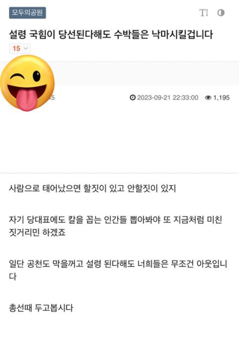 누가 ? 내가 ? ㅋ 혹시 은빈이 엄마가 국힘 찍으신데 ? 잘 됫네 집안이 아주 훌륭 하다 2찍 ㅎ