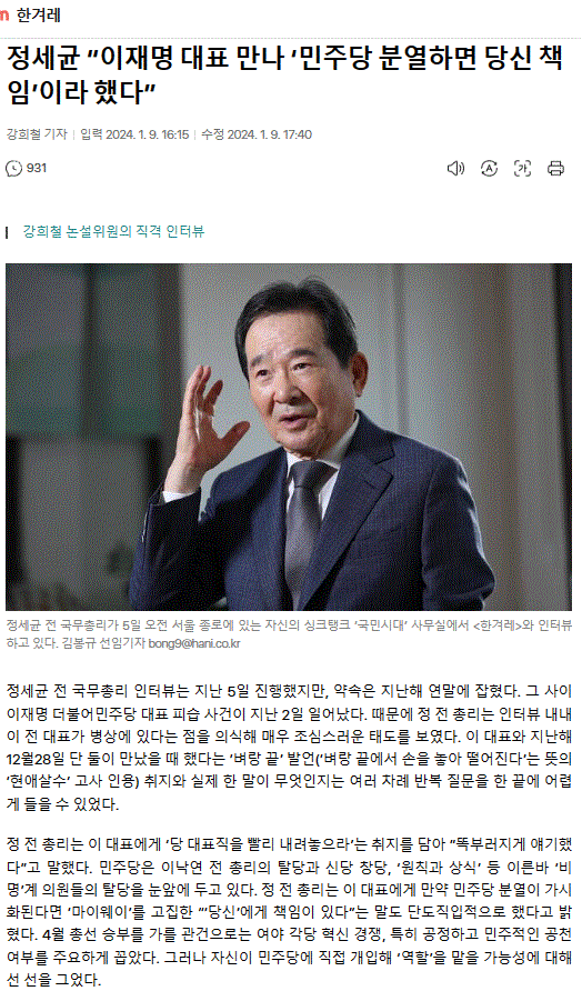 정세균 “이재명 대표 만나 ‘민주당 분열하면 당신 책임’이라 했다”