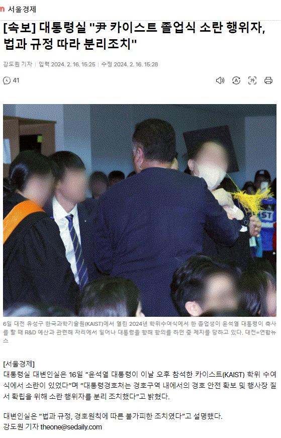 [속보] 대통령실 "경호 안전 위해 카이스트 졸업식 소란 행위자 분리 조치"