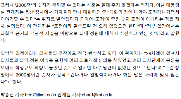 의사 증원이 필요하긴 필요합니다 그러나 단계적으로 500명씩 천천히 늘려가야지 이렇게 무식하게 한꺼번에 2000명 씩 늘리는 것은 독재국가에서나 가능한 겁니다 스웨덴에서도 우리나라가 독재국가가 되어간다고 했듯이 윤정권은 상식이 전혀 안 통하는 독재국가 입니다