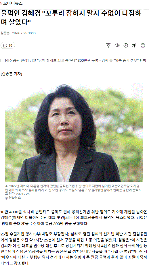 울먹인 김혜경 "꼬투리 잡히지 말자 수없이 다짐하며 살았다"