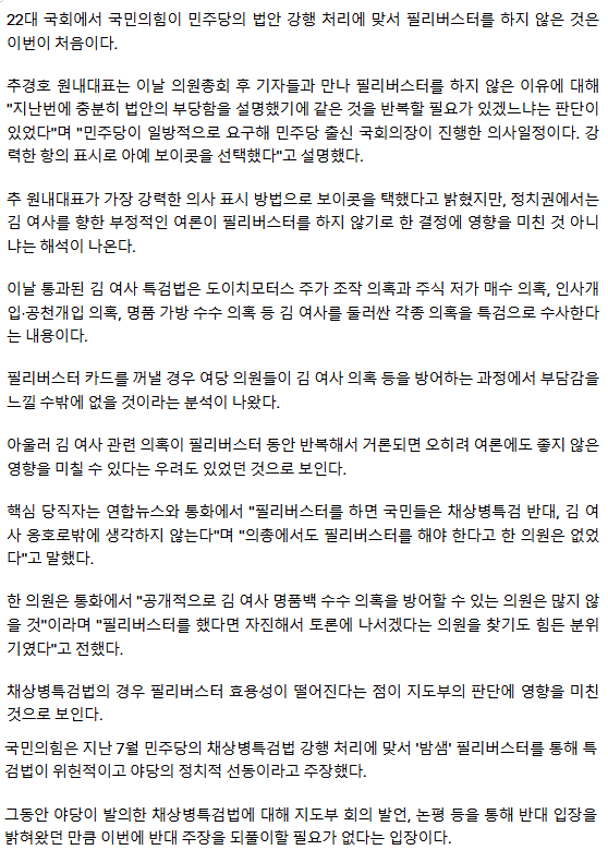 김여사 여론에 부담 느꼈나… 與, '맞불 필리버스터' 첫 생략