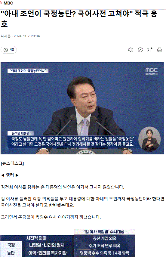 "아내 조언이 국정농단? 국어사전 고쳐야" 적극 옹호