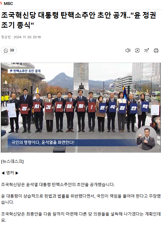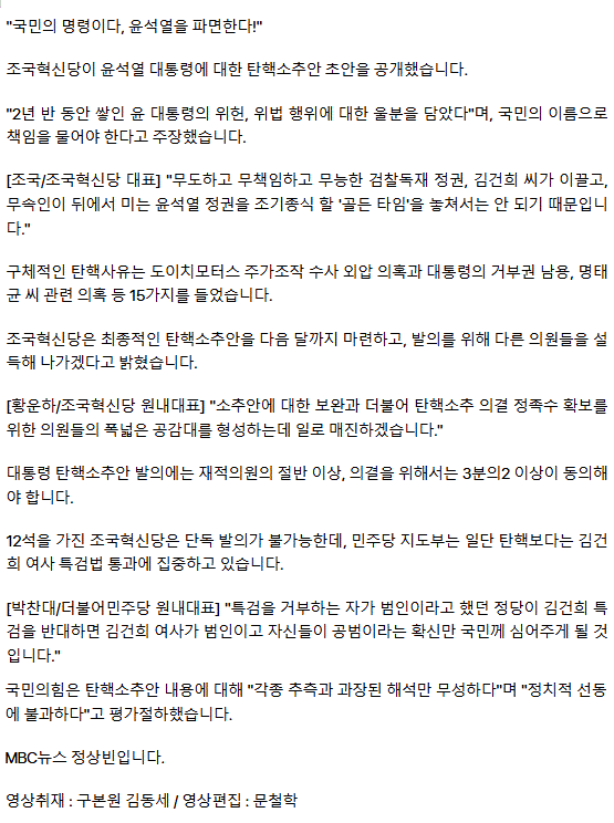 조국혁신당 대통령 탄핵소추안 초안 공개‥ "윤 정권 조기 종식"