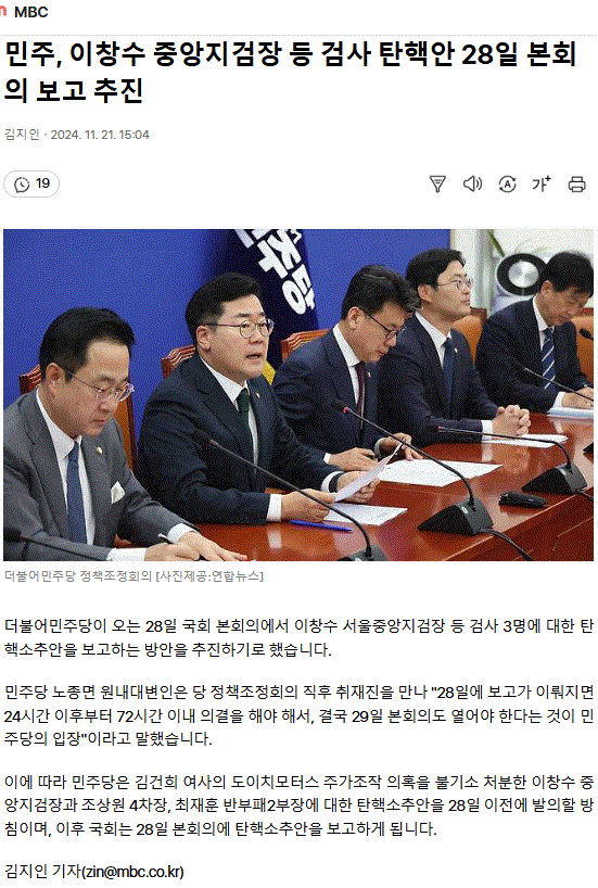 민주, 이창수 중앙지검장 등 검사 탄핵안 28일 본회의 보고 추진
