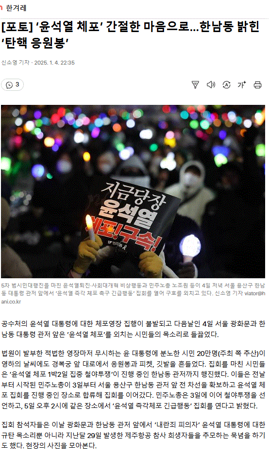 [포토] ‘윤석열 체포’ 간절한 마음으로… 한남동 밝힌 ‘탄핵 응원봉’