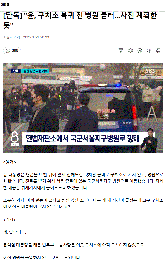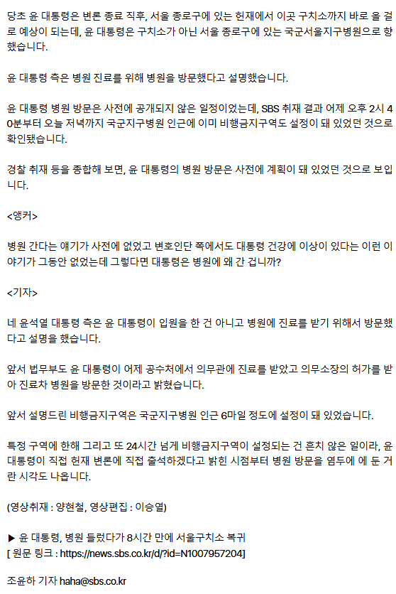 [단독] "윤, 구치소 복귀 전 병원 들러… 사전 계획한 듯" ㅡ 도망가려한 거니