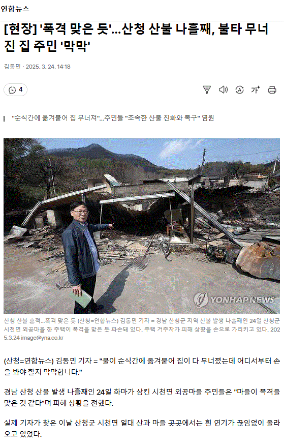 [현장] '폭격 맞은 듯'… 산청 산불 나흘째, 불타 무너진 집 주민 '막막'ㅡ 불낸사람이 책임져야