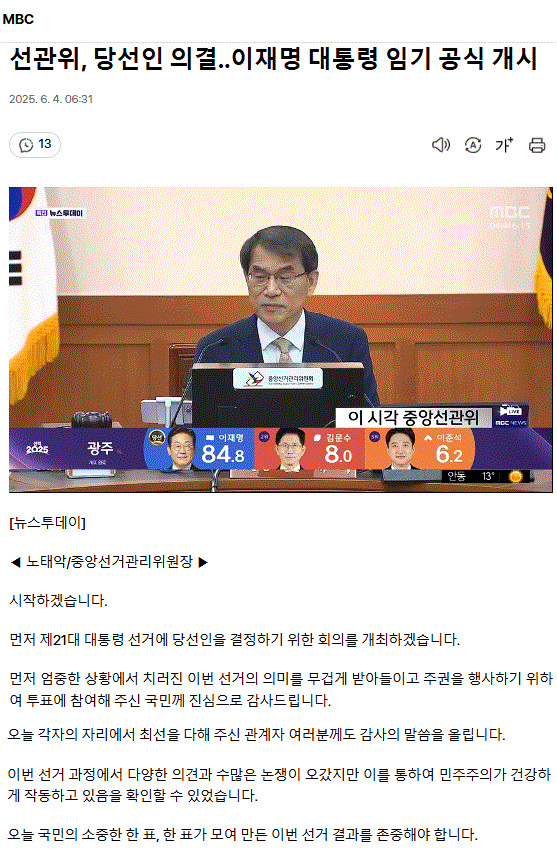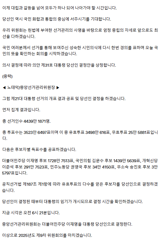 선관위, 당선인 의결‥ 이재명 대통령 임기 공식 개시 ㅡ 이재명 대통령 축하드립니다