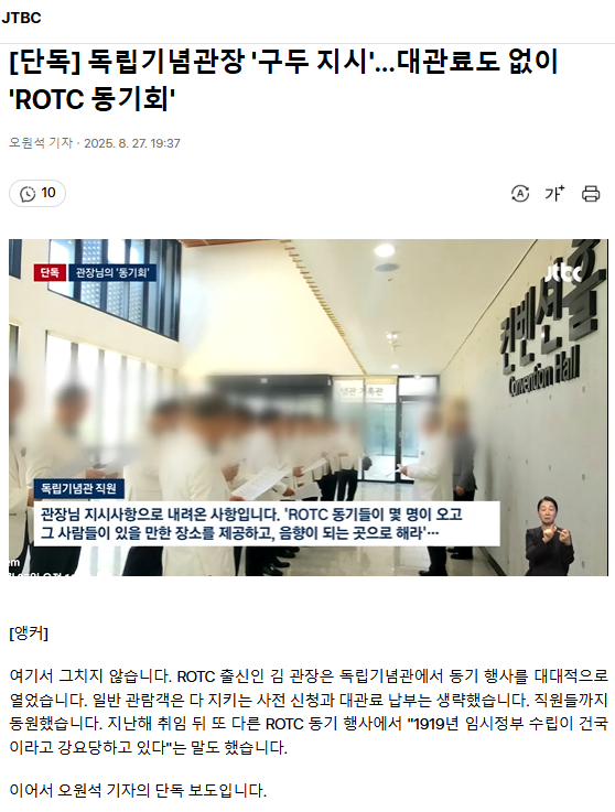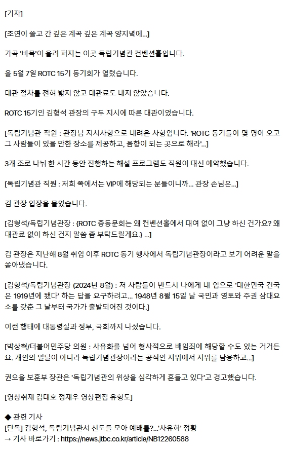 [단독] 독립기념관장 '구두 지시'… 대관료도 없이 'ROTC 동기회' ㅡ 자격 없는 김형석은 사퇴하라