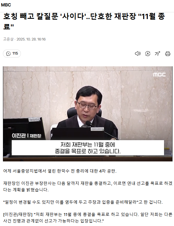 호칭 빼고 칼질문 '사이다'‥ 단호한 재판장 "11월 종료"ㅡ 윤석열 내란 재판도 맡기자