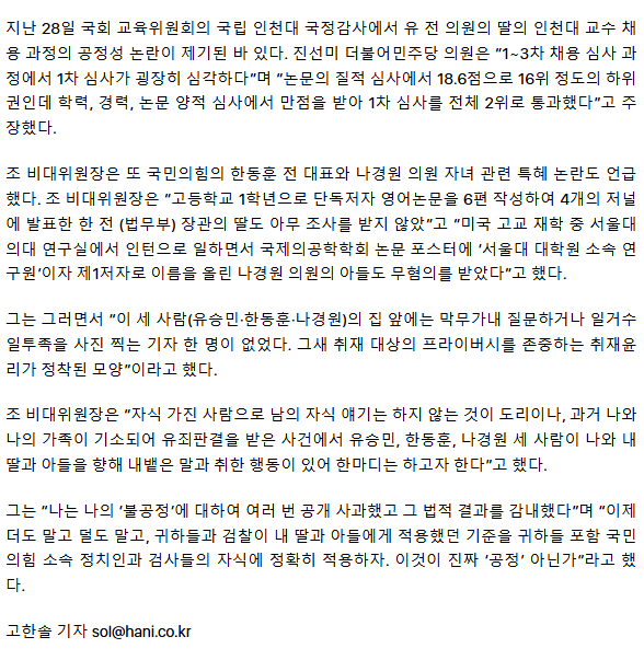 조국 “유승민·한동훈·나경원 자녀 논란, 내 딸·아들과 같은 기준 적용하라”ㅡ 저들도 감옥가자