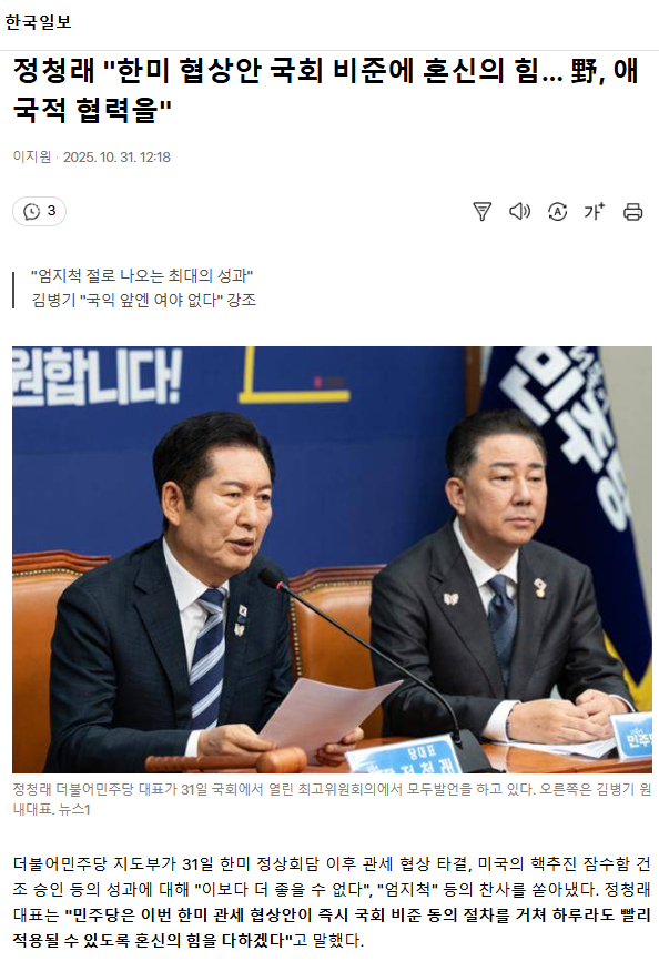 정청래 "한미 협상안 국회 비준에 혼신의 힘… 野, 애국적 협력을"ㅡ 국짐이 협조 안할거 같네