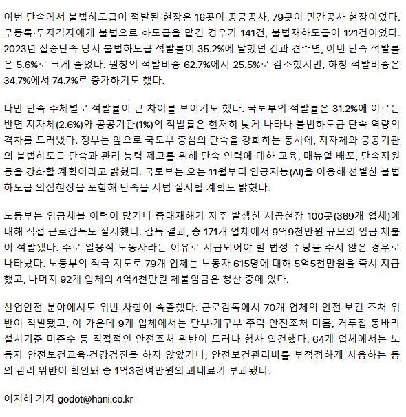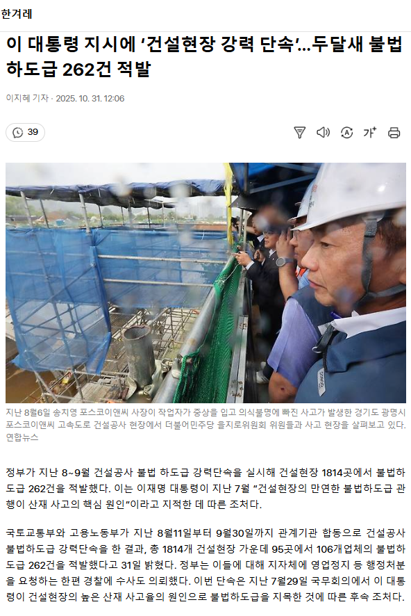 이 대통령 지시에 ‘건설현장 강력 단속’… 두달새 불법하도급 262건 적발 ㅡ 국민을 지키는 정부