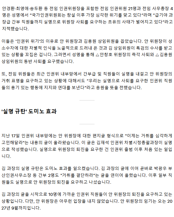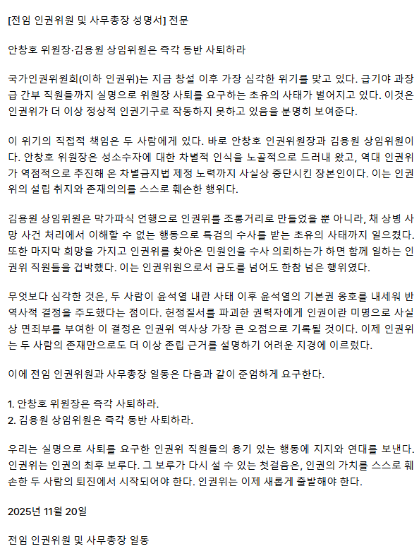 인권위 직원부터 전임 위원장까지 “안창호 사퇴하라”… 도미노처럼 번지는 '실명 규탄'