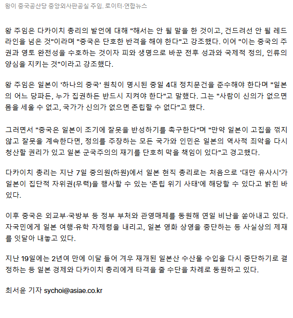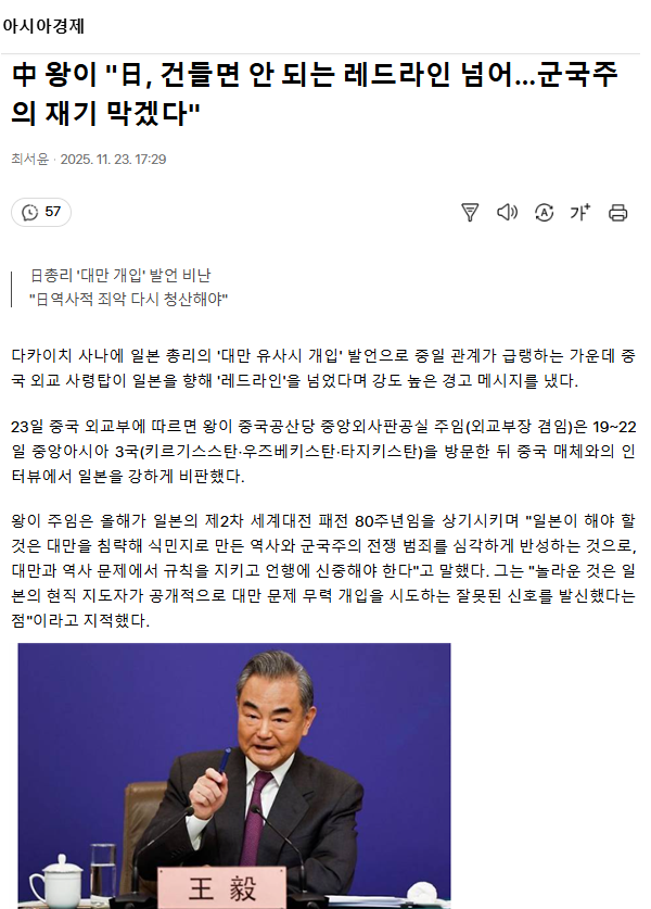 中 왕이 "日, 건들면 안 되는 레드라인 넘어… 군국주의 재기 막겠다"