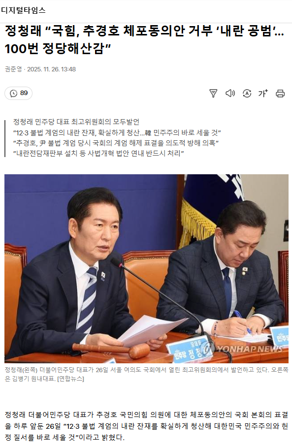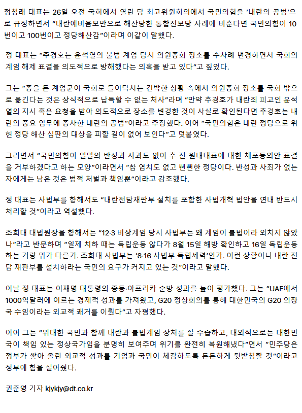 정청래 “국힘, 추경호 체포동의안 거부 ‘내란 공범’… 100번 정당해산감”