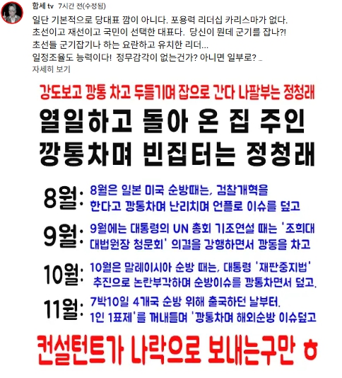이양반 도대체 왜 이러지? 기승전당대표 디스.대통령 순방 때 해야할 일들을 제대로 했는데 뭐가 불만이아?