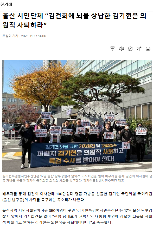 울산 시민단체 “김건희에 뇌물 상납한 김기현은 의원직 사퇴하라”ㅡ 김기현 구속수사하라