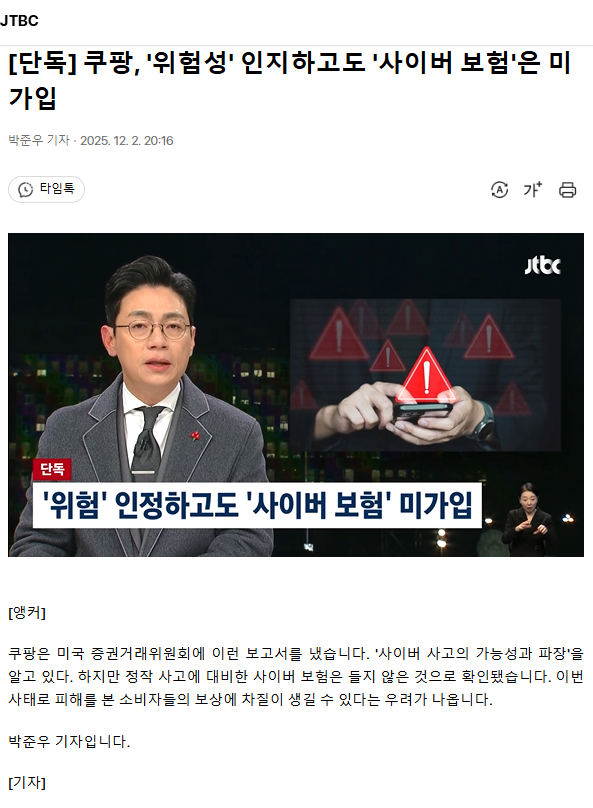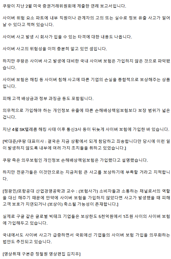[단독] 쿠팡, '위험성' 인지하고도 '사이버 보험'은 미가입