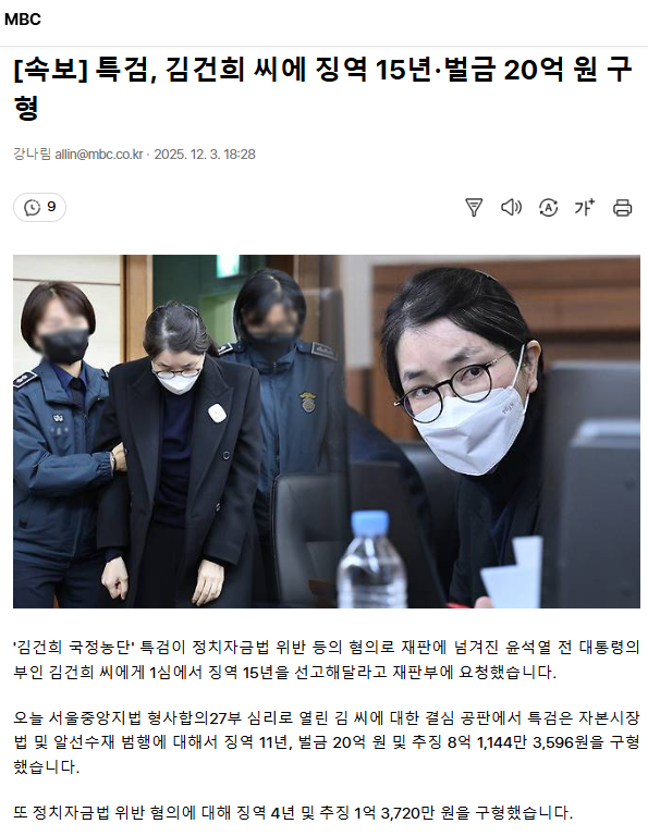 [속보] 특검, 김건희 씨에 징역 15년·벌금 20억 원 구형