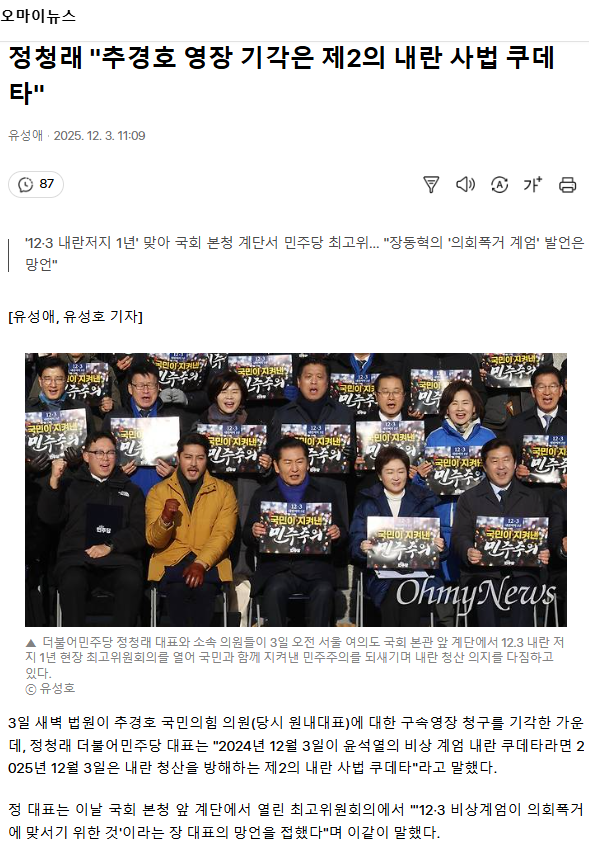 정청래 "추경호 영장 기각은 제2의 내란 사법 쿠데타"
