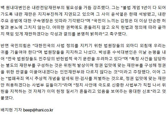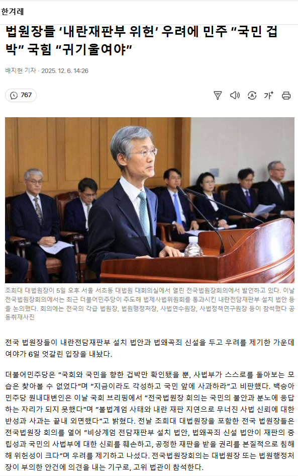 법원장들 ‘내란재판부 위헌’ 우려에 민주 “국민 겁박” 국힘 “귀기울여야”ㅡ멍멍이 소리하는 희대