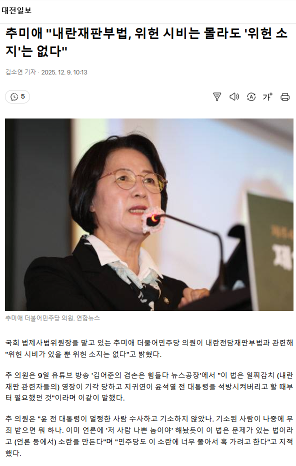 추미애 "내란재판부법, 위헌 시비는 몰라도 '위헌 소지'는 없다"
