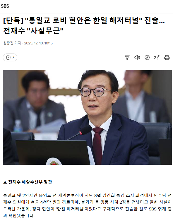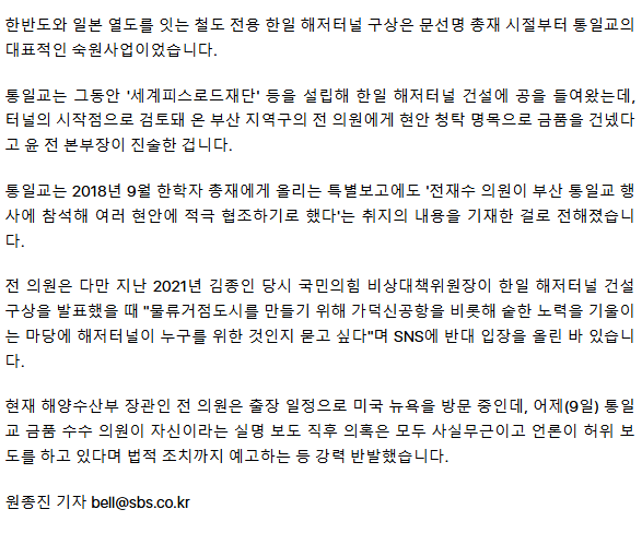 [단독] "통일교 로비 현안은 한일 해저터널" 진술… 전재수 "사실무근"