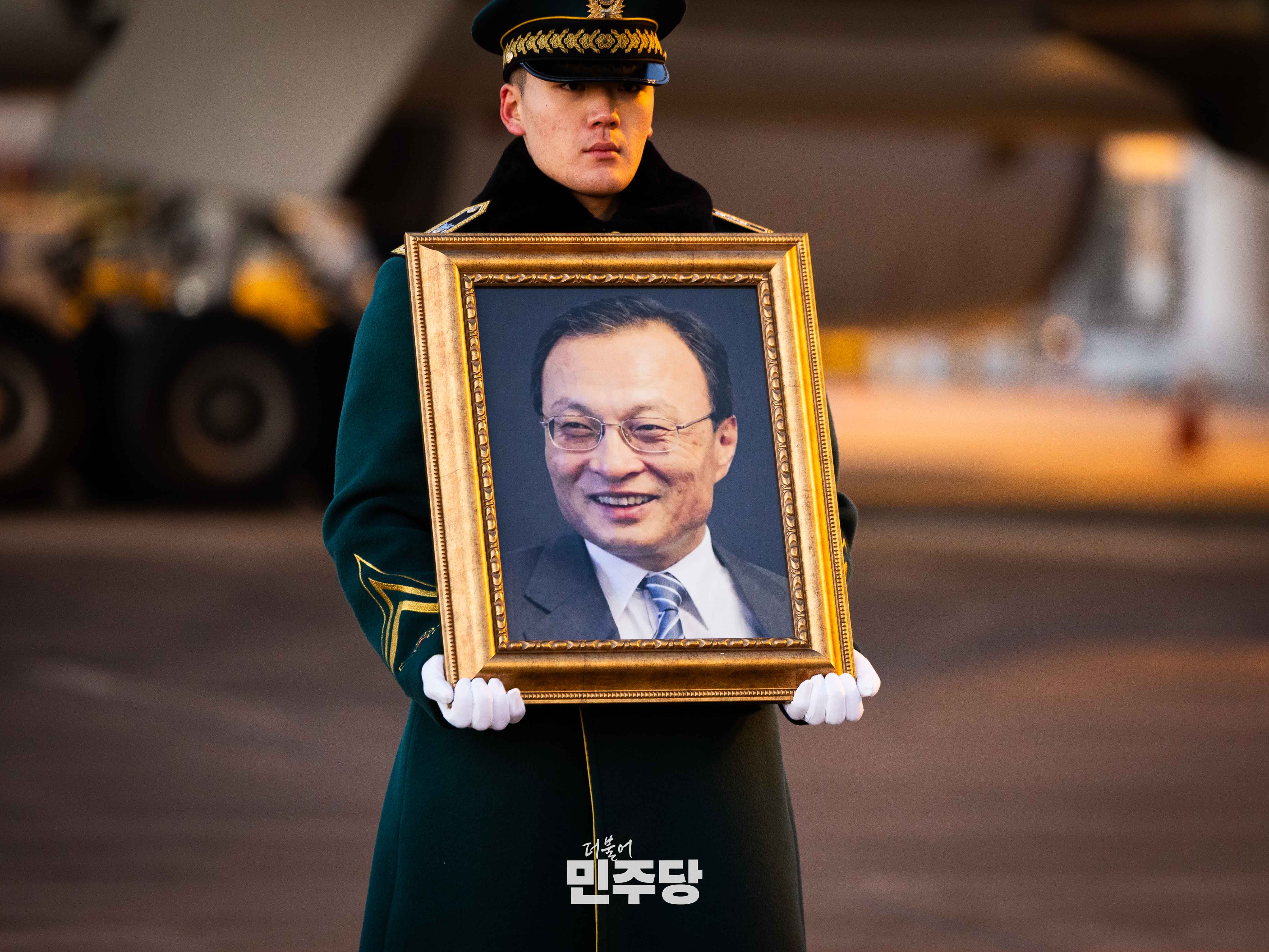 정청래 당대표가 2026.01.27.(화) 인천국제공항 제2터미널에 귀국한 故이해찬 상임고문을 영접하고 있다.