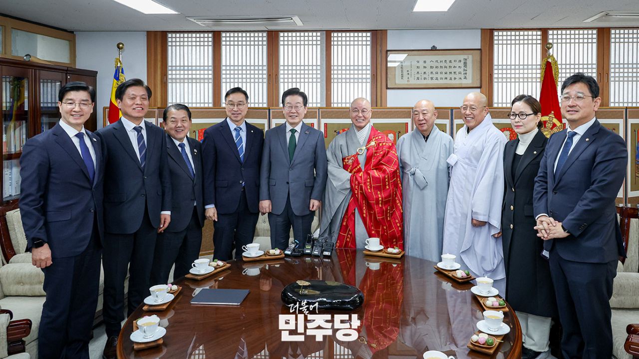 이재명 당대표가 2025.02.24.(월) 서울 종로구 한국불교 태고종 총무원에서 태고종 총무원장 상진스님과 함께 기념 촬영을 하고 있다.