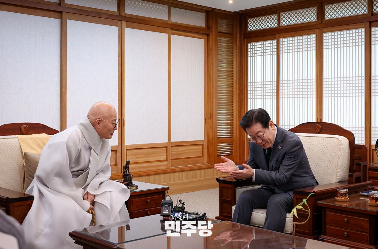 이재명 당대표가 2025.02.24.(월) 서울 종로구 한국불교역사문화기념관에서 조계종 총무원장 진우스님을 예방하여 대화를 나누고 있다.