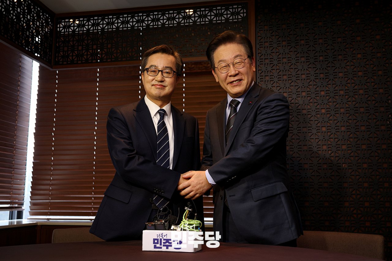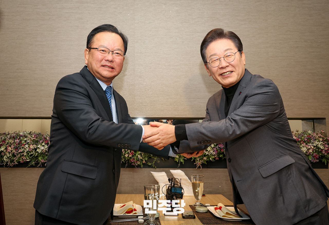 이재명 당대표가 2025.02.28.(금) 서울 여의도 한 식당에서 김동연 경기도지사를 만나 악수하고 있다.