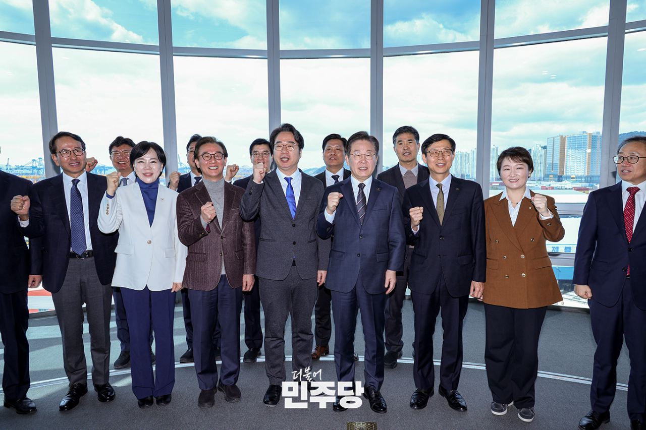 이재명 당대표가 2025.03.06.(목) 부산 강서구에 위치한 부산항홍보관에서 열린 해양강국 도약을 위한 북극항로개척 부산 현장 간담회에 참석하여 기념 촬영을 하고 있다.