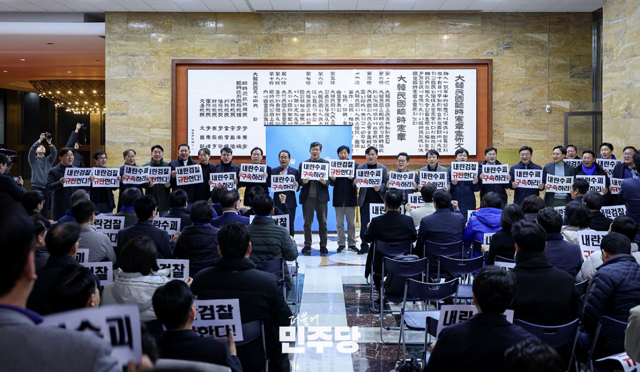 기획재정위원회·정무위원회 소속 더불어민주당 국회의원들이 2025.03.09.(일) 국회 본청 로텐더홀에서 피켓을 들고 윤석열 대통령의 파면을 촉구하는 구호를 외치고 있다.