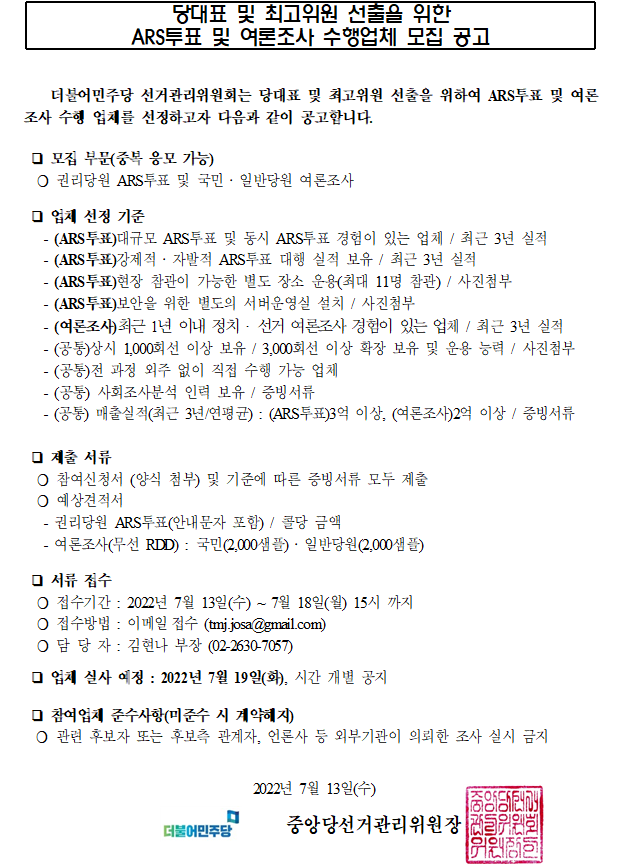 당대표 및 최고위원 선출을 위한 ARS투표 및 여론조사 수행업체 모집 공고