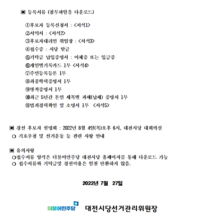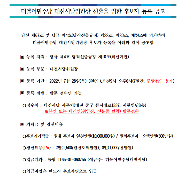 더불어민주당 대전시당위원장 선출을 위한 후보자 등록 공고