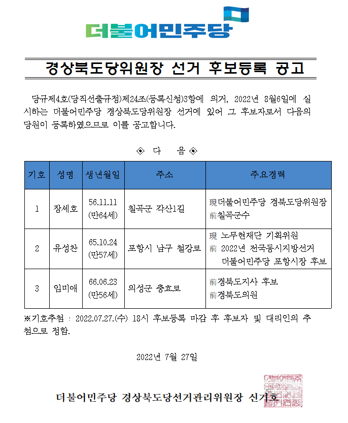 경상북도당위원장 선거 후보등록 공고