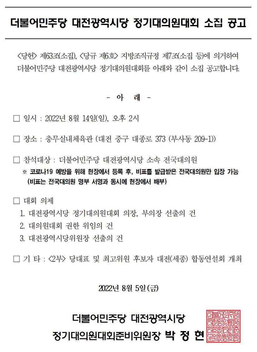 더불어민주당 대전광역시당 정기대의원대회 소집 공고