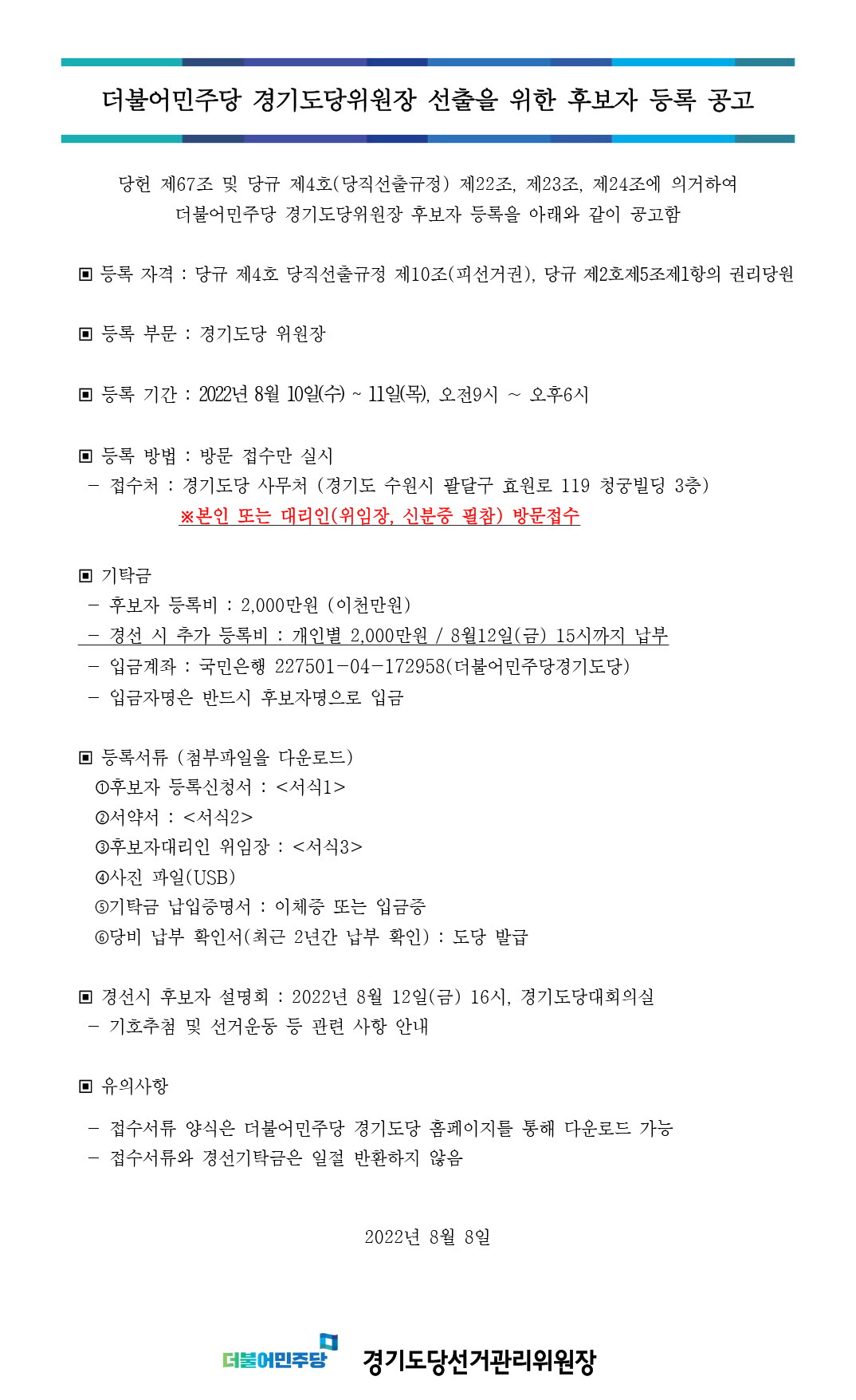 더불어민주당 경기도당위원장 선출을 위한 후보자 등록 공고