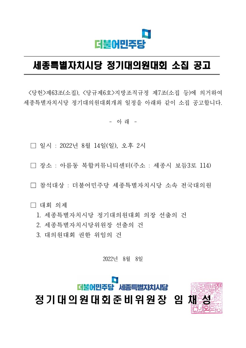 더불어민주당 세종시당 정기대의원대회 소집 공고