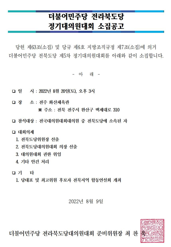 더불어민주당 전라북도당 정기대의원대회 소집공고