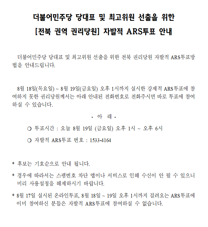 더불어민주당 당대표 및 최고위원 선출을 위한 [전북 권역 권리당원] 자발적 ARS투표 안내