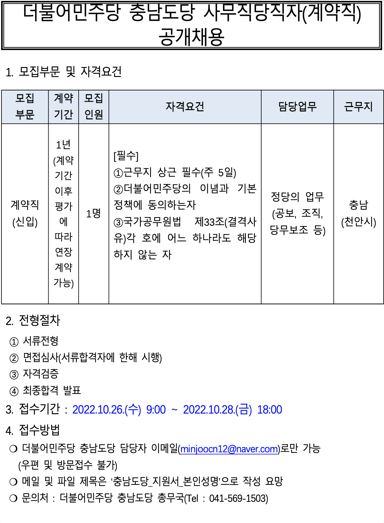 더불어민주당 충남도당 사무직당직자(계약직) 채용공고(2차)