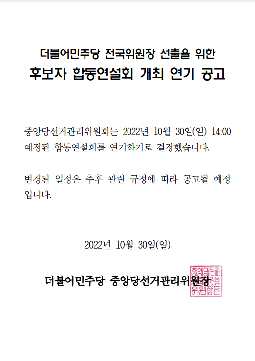 더불어민주당 전국위원장 선출을 위한 후보자 합동연설회 개최 연기 공고