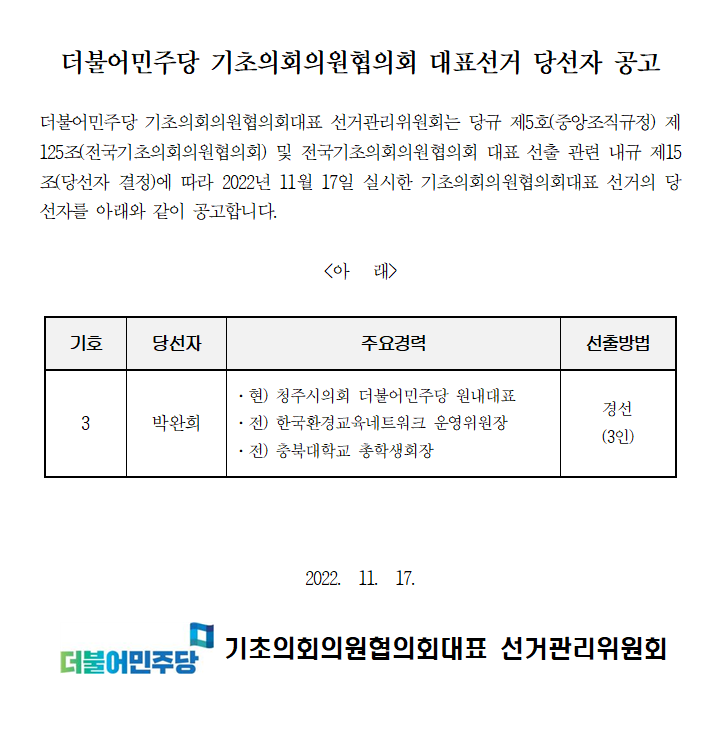 더불어민주당 기초의회의원협의회 대표선거 당선자 공고