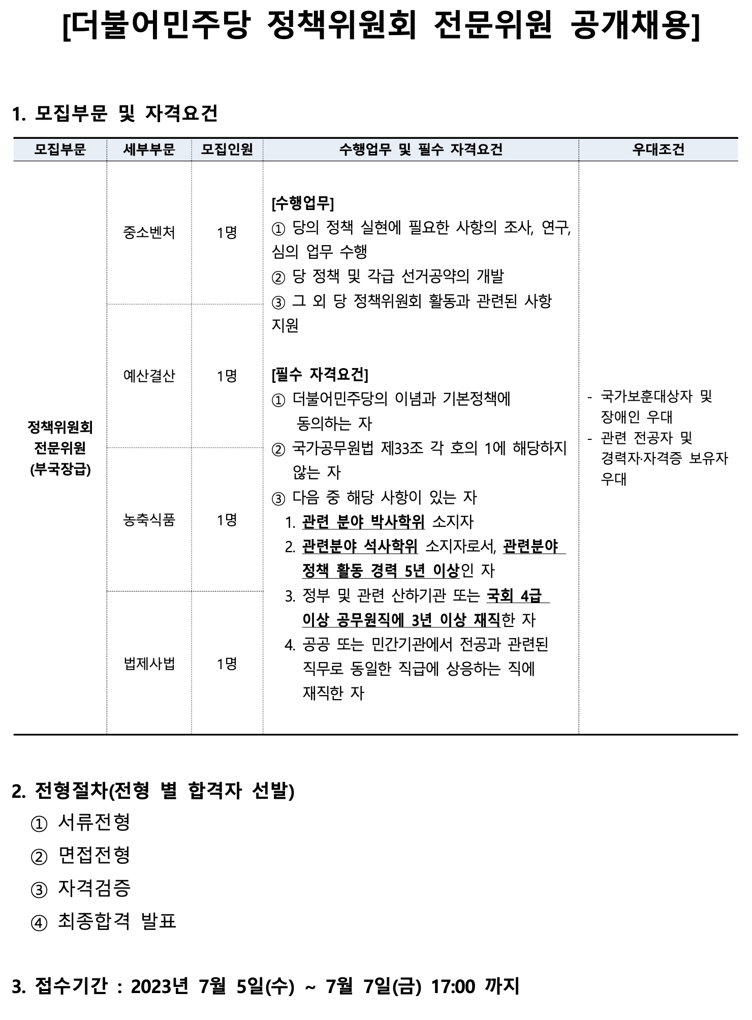 더불어민주당 전문위원 채용 공고 (기한 연장 :~7/11 17시)
