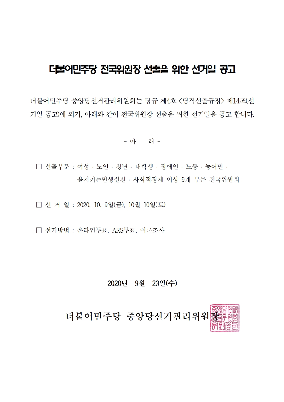 더불어민주당 전국위원장 후보자 등록 공고(수정 9/23 17:50)
