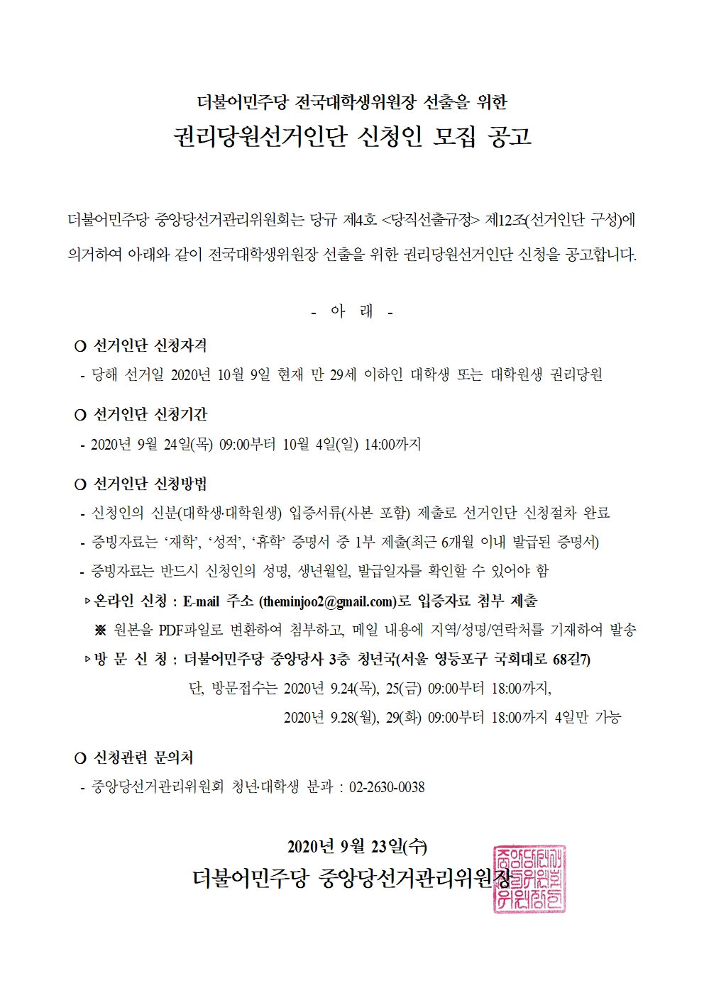 더불어민주당 전국대학생위원장 선출을 위한 권리당원선거인단 신청인 모집 공고
