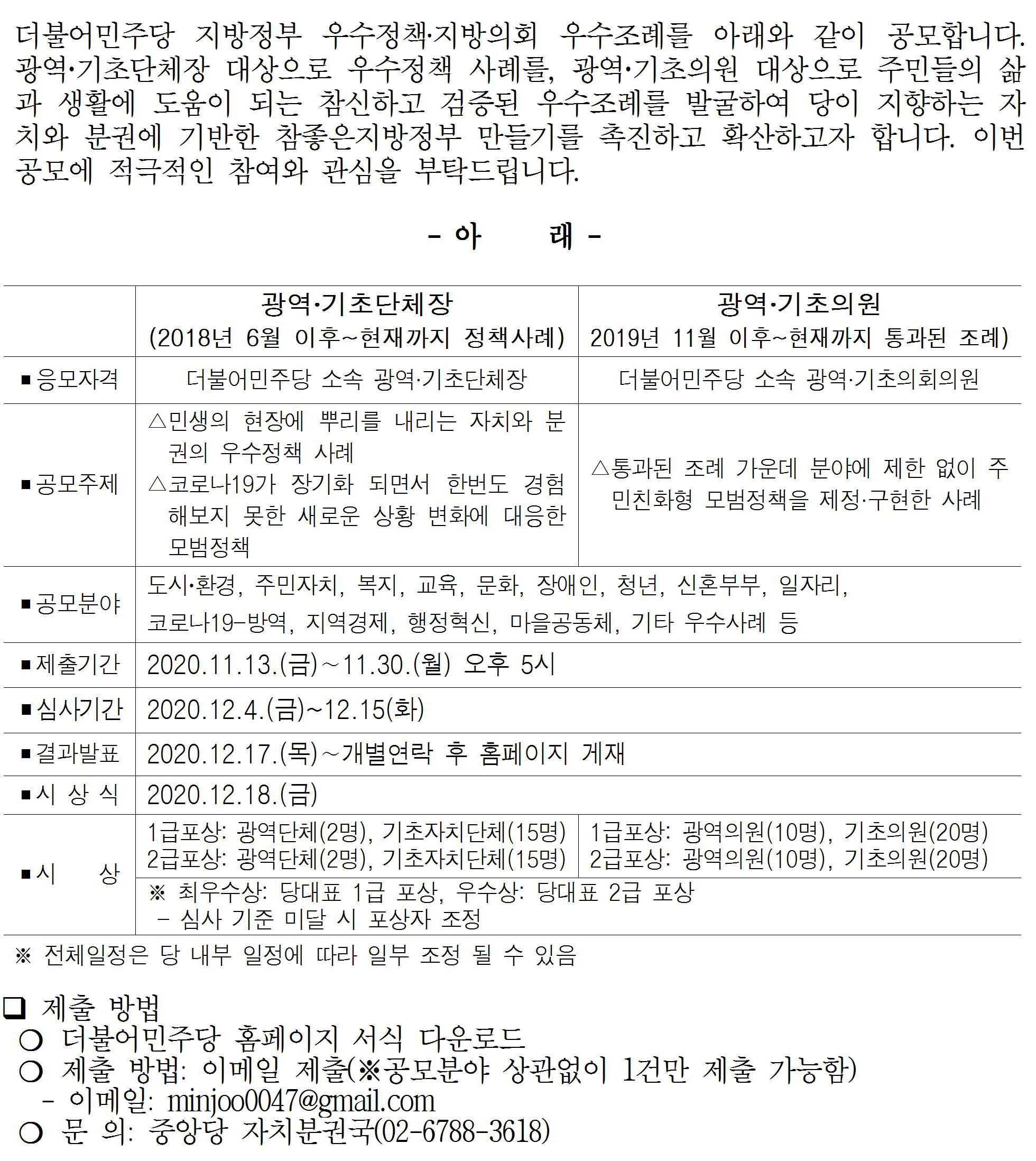 2020년 더불어민주당 지방정부 우수정책‧지방의회 우수조례 경진대회 공고